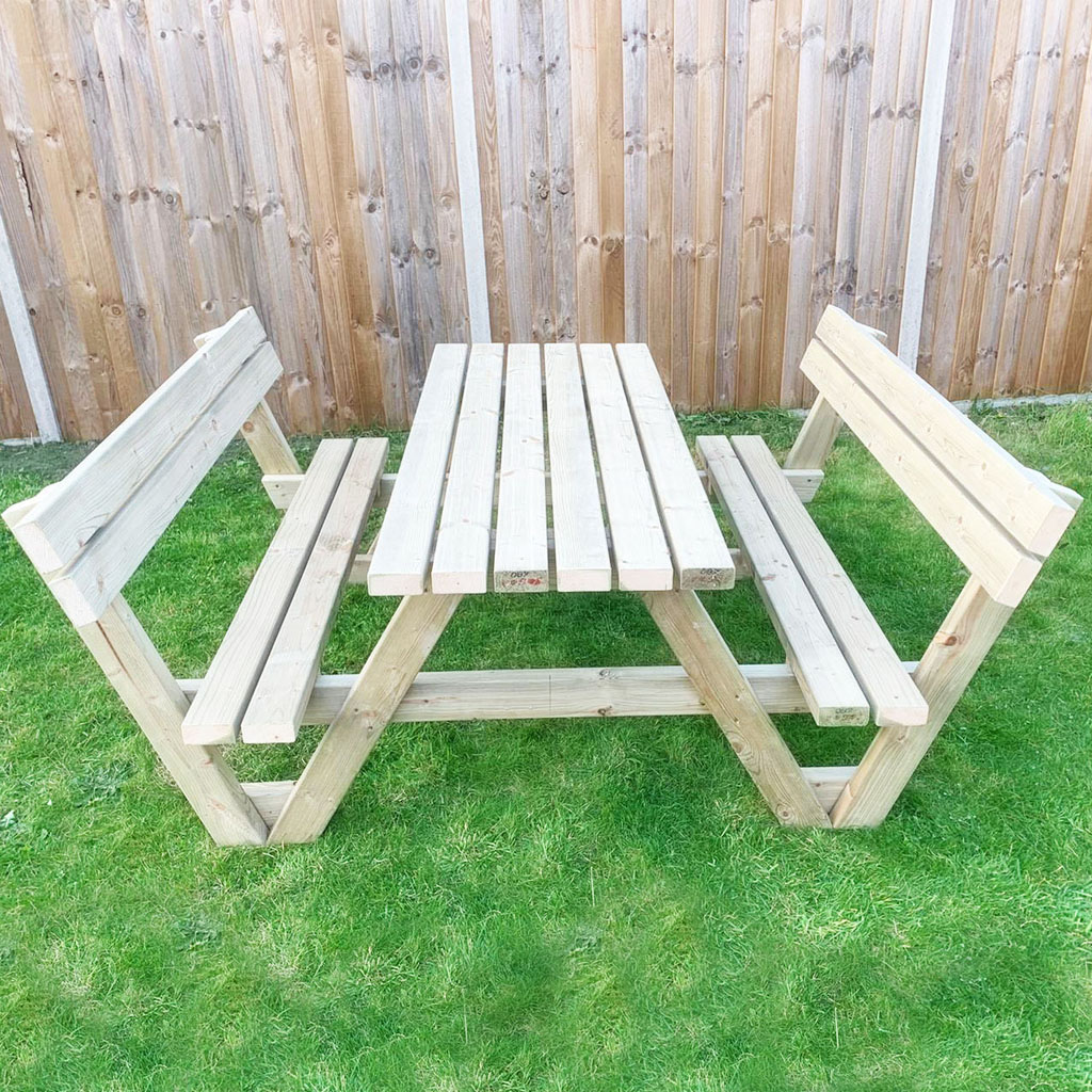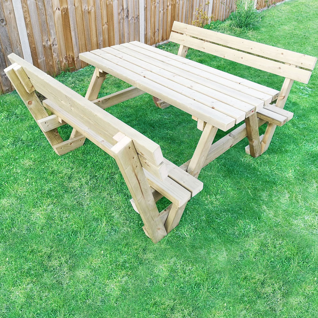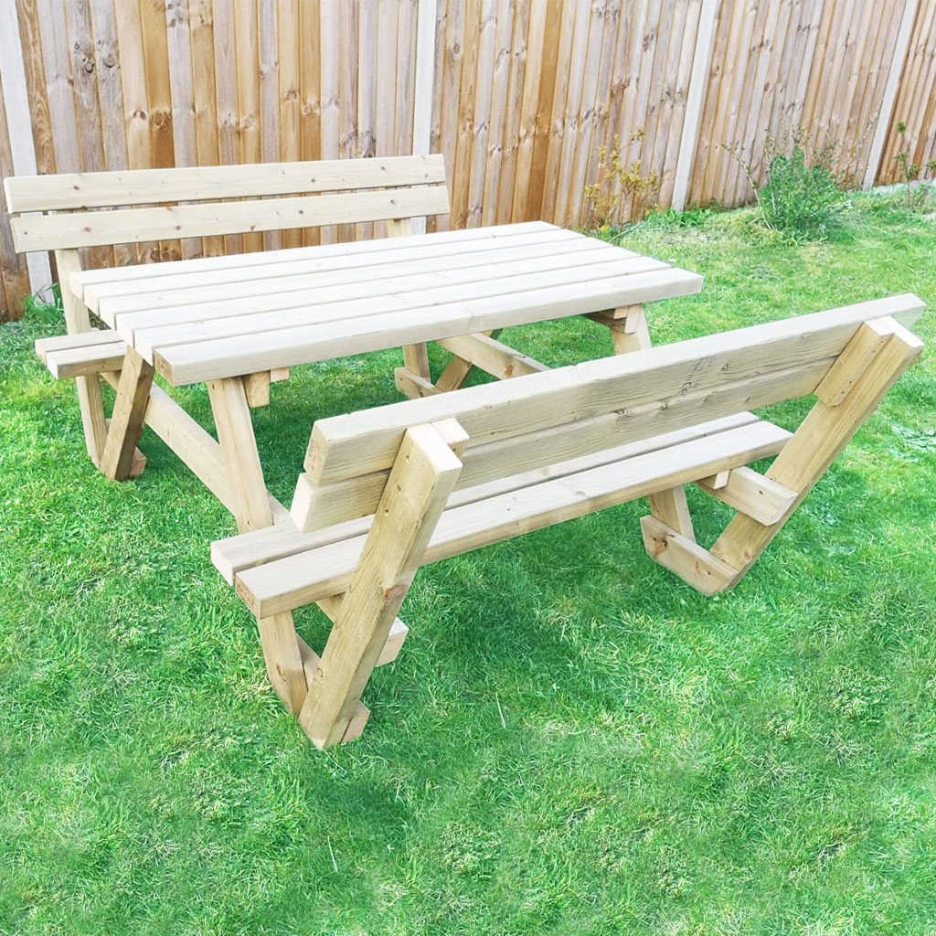 Our fabulous picnic tables with the backrest are very comfortable enabling you to relax for hours in the comfort of your garden with family and friends. The picnic table has been manufactured by us of pressure-treated pine timber and ready to stay outside or painted as your preference. The picnic bench is very strong and weather-resistant. You can safely use it outdoors all-year-round without the risk of damaging or rotting. The treated wood gives every picnic bench its own slightly greenish colour - perfect for adding a rustic feel to your outdoor areas.